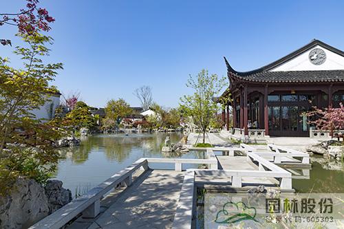 除了植物、园路等,建筑、曲桥、廊架、照壁等也在园区内错落有致地分布,在有序划分空间的同时,营造出移步换景的园林景观。