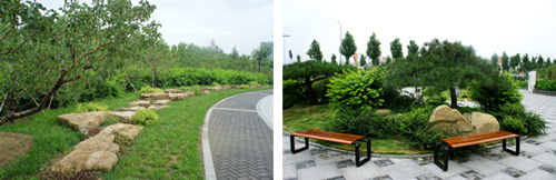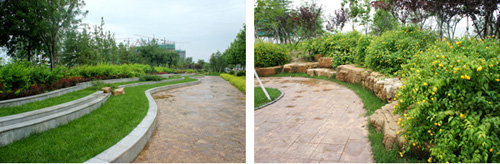 而在道路十字路口的节点处,则主要是用10cm×10cm的小花岗岩铺地,铺出来的路面整洁、平坦,看似简单,实则对施工技术要求相当高。草坪中的地面铺装,则采用花岗岩汀步,用错缝铺装法,两块花岗岩之间用草皮镶嵌,就像给每块花岗岩镶了一道绿边,与旁边的草坪和谐地融为一体。贯穿整个工程的游憩步道,全部采用“人字形”的铺装方法,中间用透水砖、两边以花岗岩镶边,透水砖价格不高,用以镶边的花岗岩是利用了铺装中剩余的边料,虽然用料简单,但通过对技术的严格要求,铺出的路面却整洁而不失韵味,是一种实用、环保、节约的做法。