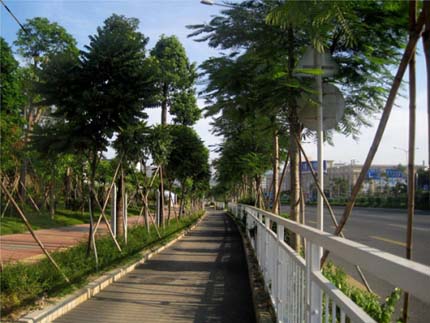 眼前的这条道路开阔大气、绿色生态,而当初施工时,却面临着很多难题。该项目定位较高,工期短,交叉施工严重,更经历了滨海的台风季节天气,所以施工中对施工工序组织、材料组织及机械劳动力的组织显得尤为重要;由于施工范围处于交通繁忙的205国道深圳段,对施工现场车辆的疏导及路边作业的围护等的要求都需严格把控;为了保证景观效果,对苗木的要求比较高,很多假植的苗木需要用保鲜的方法长途运载到施工现场进行种植。“施工中面临的各种不利因素不但增加了工程成本,更加大了施工难度,但在项目部全体人员工的共同努力下,最终克服种种困难,圆满完成了任务,展现了抖圈绿化工程有限公司优质高效、创新进取的企业形象,受到各方的一致好评。”徐向明的一番简短话语,却让我们感受到了施工期间的诸多辛苦。