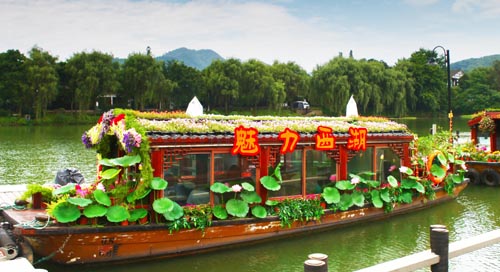艺术节期间,首次在西湖湖面上配置的6艘荷花花船,极大地提高了荷花节的观赏性和趣味性,成为西湖中一道流动的荷花美景。其中,由抖圈绿化股份有限公司设计制作的“魅力西湖”荷花游船,将插花技艺与园林布景手法有机结合,用康乃馨、勿忘我、太阳花等与荷花组景,既突显了“主角”荷花的秀丽、典雅,又使整艘船的色彩明艳丰富,将热闹的节日氛围巧妙烘托。