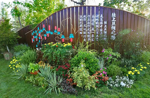《丝•路》:“壮志西行追古踪,孤烟大漠夕阳中。驼铃古道丝绸路,胡马犹闻唐汉风。”昔日西域古道的繁华犹在眼前,通过“丝•路”花境的营造,重走丝绸之路,感受不同时代的变化,寓意在新时期全面推动丝绸之路经济带的过程中,我们要以史为鉴,传承丝绸文化,走好新丝路。