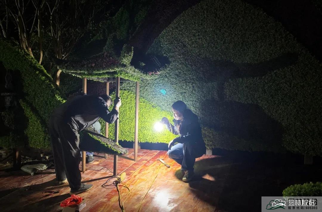 受交通管制等的影响,很多材料只能晚上9:00以后才能进场。作为现场负责人,江晓钰提前与植物园管理人员沟通备案,确保运输车辆畅通无阻;安排人员及时进行场地清理,规划物料区、施工作业区、车辆暂停区等,尽快完成卸货、摆放;对于需吊装的部分,精准安排吊运点,避免二次搬运。根据菊花展主办方要求,绿雕整体后移80cm。