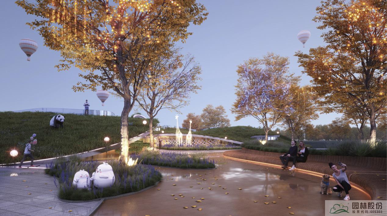 本区域位于场地中心,设计片石戏水汀步,增加人与水体的互动;云朵广场设计云朵廊架、异形座椅,突出景观互动性和多样性,打造生态与现代活力相交融的景观。