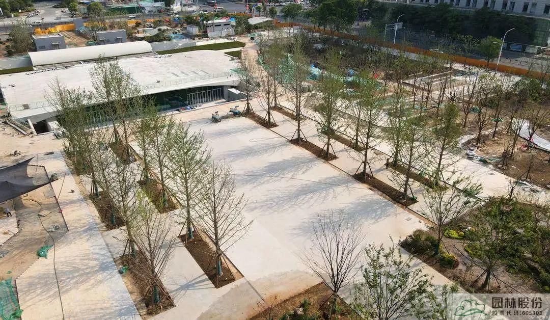 在中心广场位置,施工方精心移栽了4排、共24棵高大银杏树,树木排列整齐划一,翠绿的枝叶相互掩映,树下设有林荫座凳,夏季可有“大树成荫”之景,市民可观赏可乘凉,能充分感受自然野趣。