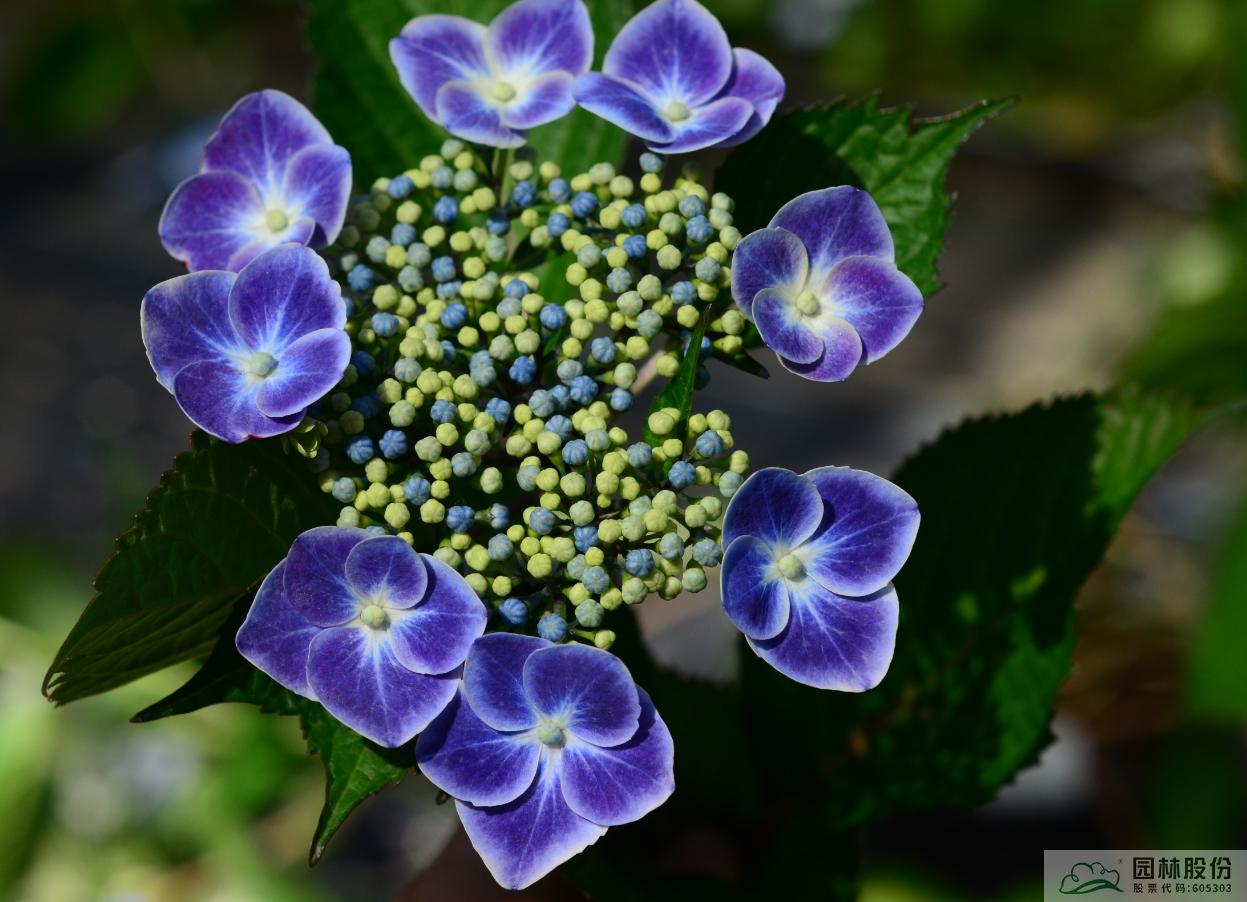 大叶绣球‘梦幻星空’:伞房状聚伞花序盘状,高度2~4cm,直径10~12cm,上海及杭州5月中下旬开花,可延续至6月下旬;可孕花花瓣蓝色;不孕花萼片先端白色至浅蓝色中部蓝色至紫色基部白色;花色梦幻,花型飘逸,适合家庭园艺和工程。