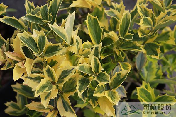 桃叶‘金心’Ilex aquifolium 'Myrtifolia Aurea Maculata ':是一种生长缓慢的常绿灌木,具有浓密、紧凑的习性,幼茎紫色。叶狭披针形,叶缘绿色,中心金黄色,其间伴有浅绿过渡色,非常吸引人。但它的花朵很小,呈白色或淡黄色,是雄性的。耐寒温度约为-27°C,适合在光照充足到半阴的通风湿润不积水的环境下生长。由于它生长缓慢和丰富的叶色,非常适合作为容器苗植物应用于庭院。